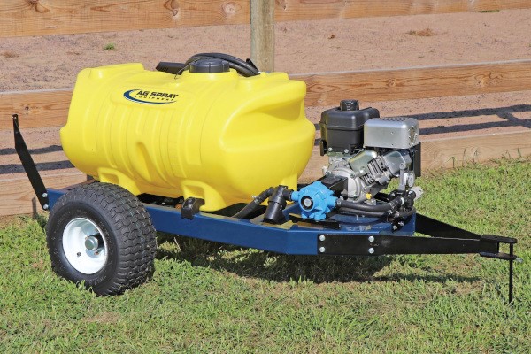 The 60 Gallon 6.5 B&S-8C Gas Trailer Sprayer is designed for the homeowner needing mid-level capacity and high performance. The UV resistant, molded polymer tank has a 5 inch tethered lid for easy access and is completely drainable. This model features a 6.5 Briggs & Stratton Gas Engine and 8 Roller Cast Iron Pump with a 11 GPM flow capacity. The Deluxe Pistol Grip Spraygun distributes up to 40 feet of horizontal spray and 30 feet of vertical spray and comes with 25 feet of 3/8 inch hose. Large 18 x 9.50 x 8 Pneumatic tires provide a smooth ride over any terrain and easy pulling. This tow-behind sprayer allows easy, accurate and consistent liquid application of lawn care products for a healthy lawn or well manicured turf. This pull behind sprayer is designed for controlling weeds, insects and diseases on lawns, ball fields, parks, golf courses, acreages and small pastures.