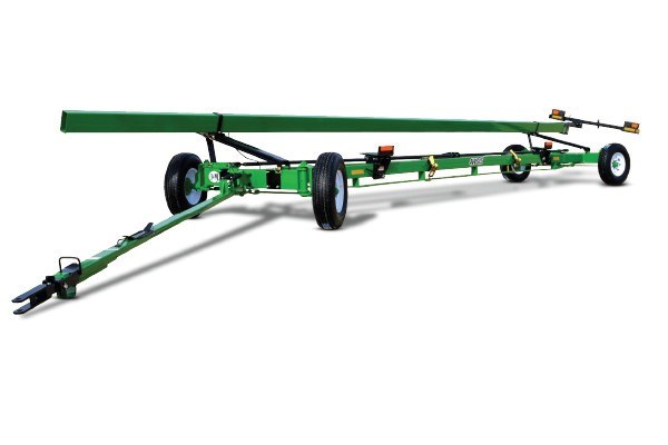 HT-974 Series transports feature an economical, low-profile design with front steering for quick and easy towing. Now, also available in heavy-duty 20' transports for folding corn and heads.