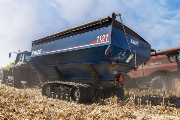 The proven, straightforward dual auger design of the 1121 provides the key features necessary for efficient grain handling. The on-demand horizontal auger, optimum 1100-bushel capacity, tip spout control, and multiple undercarriage options deliver high value at a low cost of ownership. Robust construction, along with minimum driveline and track system maintenance, ensures an uninterrupted and productive harvest.