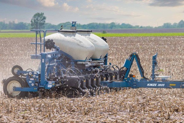The proven design of the Kinze 3605 pivot fold planter has planted countless acres around the world, and dependably and efficiently plants year after year for a great return on investment. With 80 bushels of bulk fill seed capacity, up to 600 gallons of liquid fertilizer, and True Rate vacuum meters, it quickly plants wide or narrow-row crops. Optional split rows, pneumatic down pressure, 4,400 lbs. dry fertilizer capacity, and bulk fill or row unit hoppers provide you the versatility you need on your farm. Also available with variable hydraulic or ground contact drive, finger pick-up meters, and brush meters 2.0.