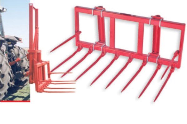 The Tine Bucket is set up with ten spring steel tines. Eight offset tines are on the bottom with two straight tines on the side. Excellent for hauling silage and moving bales. It can be used with your front-end loader or as a rear-mount attachment on our HFC Thrifty Lift unit.