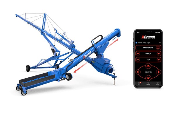 Optional electric-over-hydraulic controls integrate with the Brandt LeadHand™ app for full remote control of swing hopper placement.
