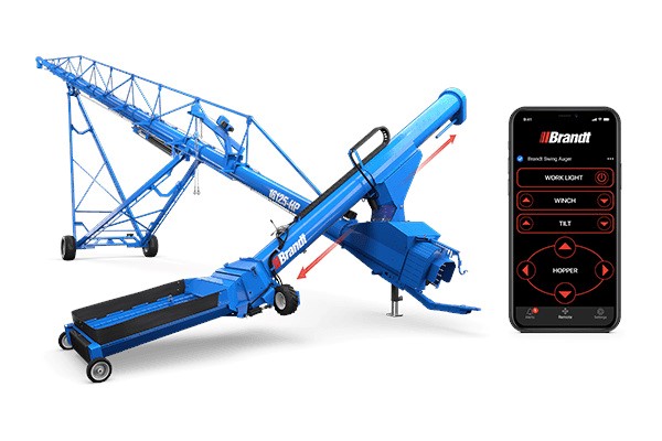 Optional electric-over-hydraulic controls integrate with the Brandt LeadHand™ app for full remote control of swing hopper placement.