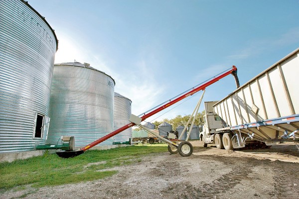 The double flighting intake increases grain flow. A narrow safety guard and removable clevis hitch improve access to bins with small auger ports.
