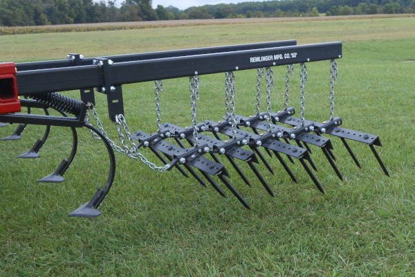Remlinger’s Heavy Duty Flexible Angle Iron Harrow mounts on disk chisels, V-rippers and other primary tillage tools, also available on disks. The attachment helps to break clods and level soil.