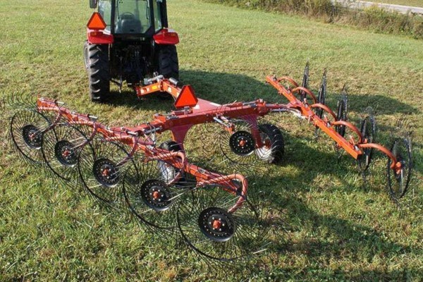 The VR hay rake is perfect for changing conditions and uneven terrain with its simple adjustments for windrow and working widths and independent spring suspension, which enables each rake wheel to work individually for a clean sweep. This V-Type rake is available in 8-, 10-, or 12-wheel configurations, and the rake sections fold horizontally over the carriage for narrow transport width and extra stability.