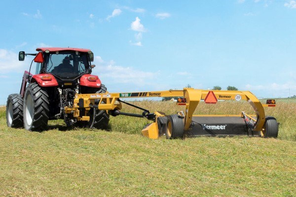 Mow around tight corners with the swivel gearbox on the drawbar. With a pivoting header gearbox and a CV joint, the mower can operate on the side of or directly behind the tractor.