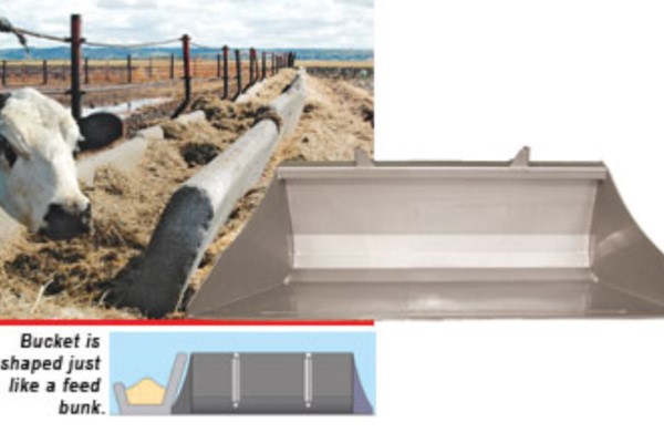 Patented bucket design is tapered on all sides for quick release of materials. The Feed Bunk Bucket has a side plate with a wider flare that makes it possible for the sides of the bucket to reach under the lip of the feed bunk.