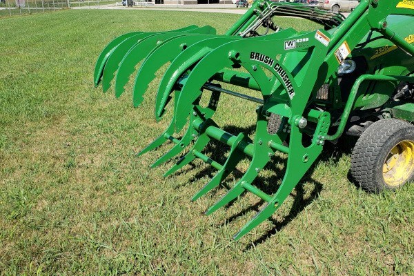 The new patented BC-4200 brush handling attachment makes those painful labor intensive tasks like clearing trees, handling brush, or even cleaning up after a storm--Fun! The BC-4200 model is a mid-sized model of the Brush Crusher™ family. It's adjustable so you can get the tooth action that you need. It is designed to fit on the John Deere coupler of several different loaders. Be sure to request the additional teeth for some extra grabbing power, or just ask for the "4215".