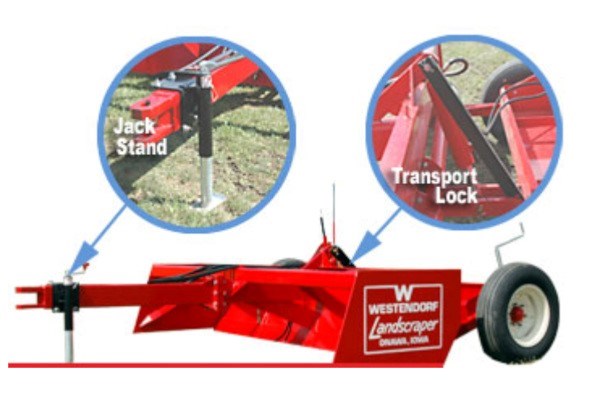 The Jack lets you store the Landscraper™ when not in use. The Transport Lock lets you lock the weight box in the raised position so you can hook the unit up to a pickup or other vehicle and tow it around the yard or several miles to another location.