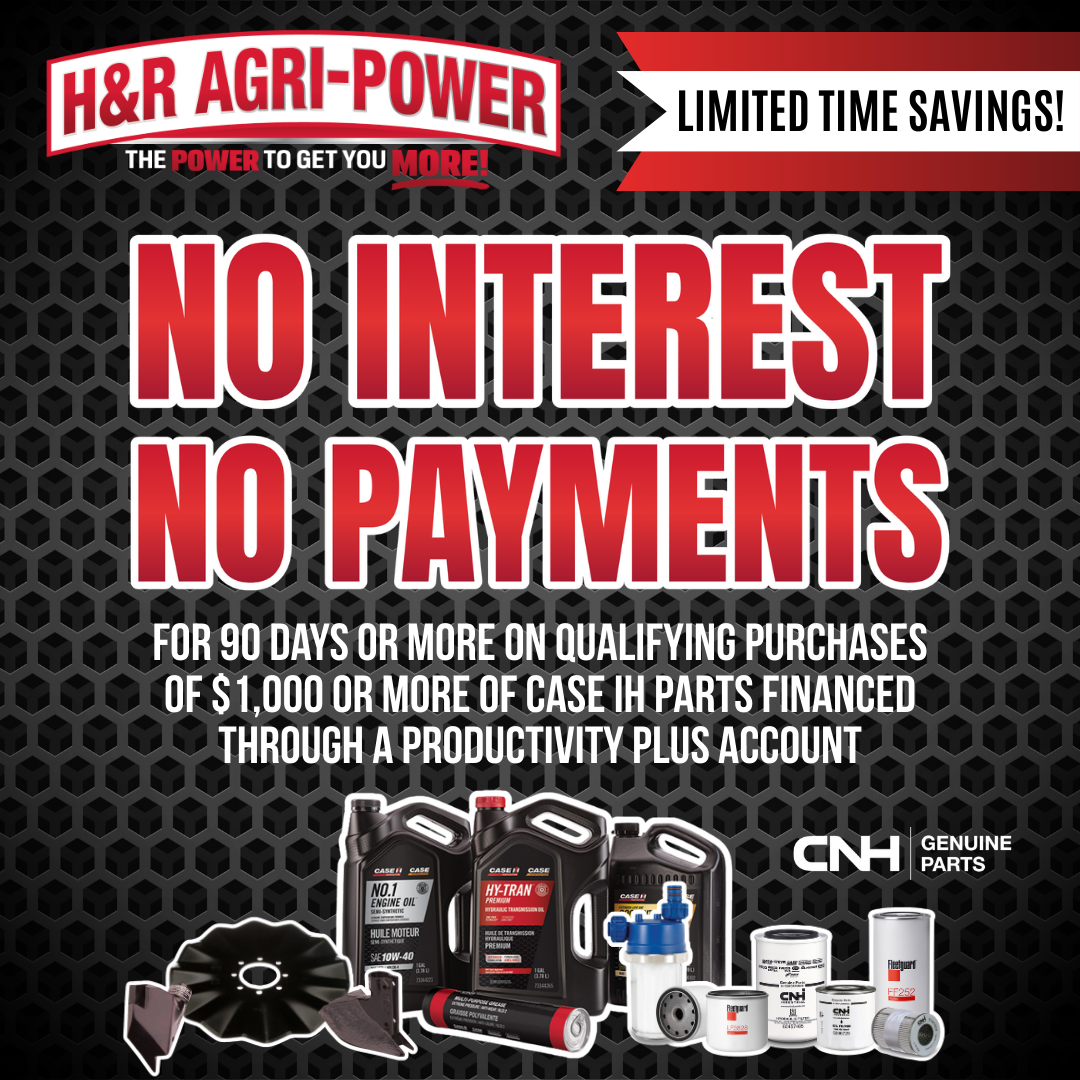 For commercial use only—not intended for personal, family or household use. No interest and no payments for 90 days or more on qualifying purchases of Case IH parts of $1,000 or more, when such purchases are made using a CNH CapitalSM Productivity Plus Account (the “Account”) during a single visit to a participating dealer between 1/1/2026 and 4/30/2026. The promotional period and promotional terms applicable to any Account balance resulting from such purchases are subject to early termination in the event any payment is not made on any other balance outstanding under the Account when due during the promotional period. Standard terms and conditions for the Account will apply to promotional balances after the termination or expiration of the promotional period