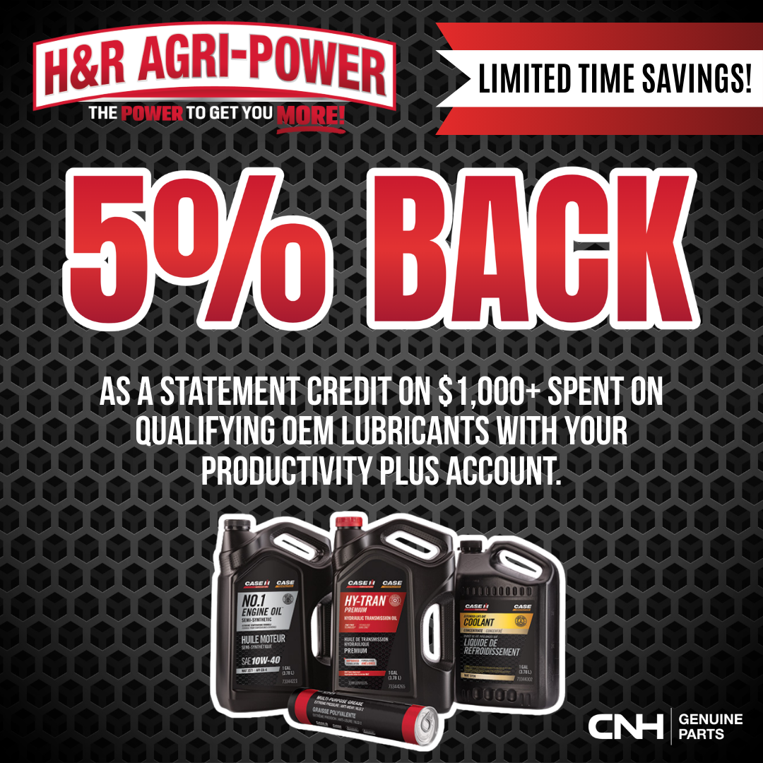 Offer applies to total qualifying net purchases (qualifying purchases minus any credits or returns and excluding tax) of $1,000 or more of genuine OEM engine and hydraulic oil, grease and coolants charged to a CNH CapitalSM Productivity Plus Account (an “Account”) at participating Case IH dealerships between 3/1/2026 and 4/30/2026. Excludes service and labor. Statement credits earned for qualifying net purchases made during the period of 3/1/2026 and 4/30/2026 will be awarded on or before 6/15/2026 for Accounts with charges for qualifying net purchases (as described above) of $1,000 or more during such period. Statement credits must be used by 12/31/2026 or will be forfeited. An Account must be open and in good standing at the time a statement credit is to be applied and statement credits may not be used to satisfy any minimum payment due on an Account. Statement credits awarded to an Account may only be applied toward charges on that Account, and will not be transferable, payable, refundable, or otherwise made available. For commercial use only – not intended for personal, family or household use. Customer participation subject to available credit and good standing on all CNH Capital accounts. Offer subject to change or cancellation without notice.